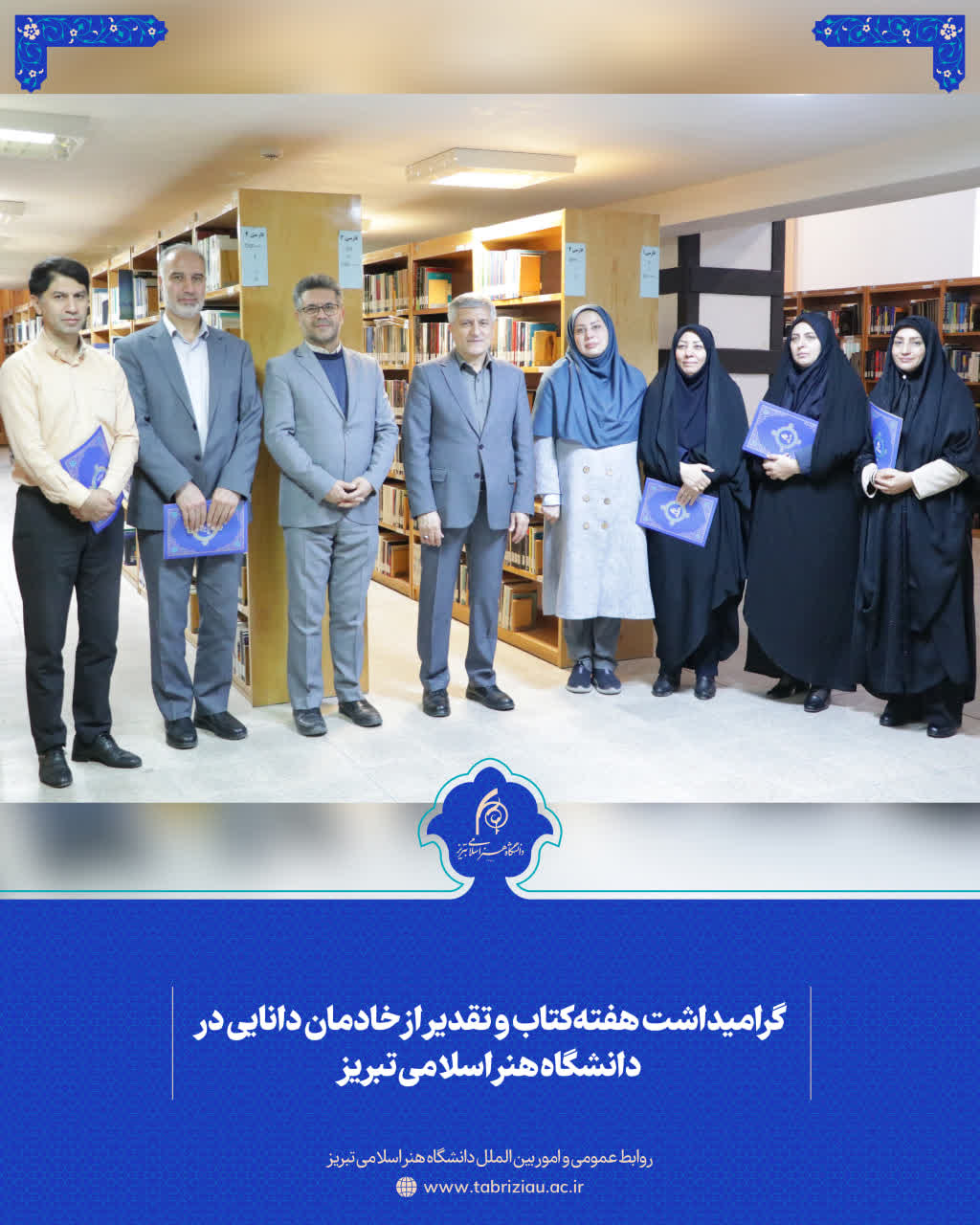 به گزارش روابطعمومی و امور بینالملل دانشگاه هنر اسلامی تبریز، مراسم گرامیداشت هفته کتاب و کتابخوانی و تقدیر از کارکنان کتابخانه دانشگاه، با حضور رئیس دانشگاه، اعضای هیئترئیسه و پرسنل کتابخانه در محل کتابخانه دانشگاه برگزار شد.