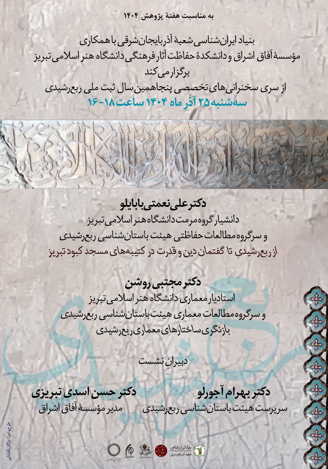 به گزارش معاونت پژوهش، کارآفرینی و فناوری دانشگاه هنر اسلامی تبریز، نشست تخصصی «پنجاهمین سال ثبت ملی ربعرشدی» به مناسبت هفته پژوهش و با همکاری بنیاد ایرانشناسی شعبه آذربایجان شرقی، مؤسسه آفاق اشراق و دانشکده حفاظت آثار فرهنگی دانشگاه هنر اسلامی تبریز برگزار میشود. این نشست با هدف بازخوانی جایگاه تاریخی و فرهنگی مجموعه ارزشمند ربعرشدی و ارائه تازهترین دستاوردهای پژوهشی در حوزههای باستانشناسی، معماری و تاریخ این مجموعه برگزار میشود. در این رویداد، پژوهشگران برجسته به تشریح ابعاد مختلف این اثر ملی و اهمیت آن در مطالعات علمی- تاریخی خواهند پرداخت.